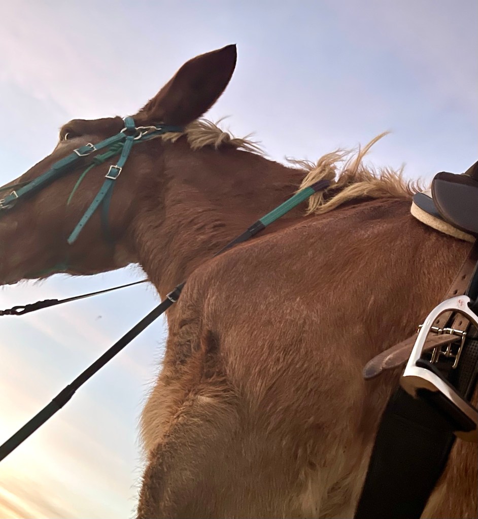 And my sweet Reina proves herself a saint of a mule on a regular basis. While I haven’t fallen off of her (yet), I’ve managed to fall UNDER her twice now. One of those times the saddle went with me. (I’d forgotten how often cinches need to be checked for tightness!) That’s a nightmare scenario with most horses, as a saddle hanging from the belly is likely to trigger a spook, possibly trampling the rider and injuring the horse. But my steady steed isn’t the least bit startled by my clumsiness and ineptitude. She just watches me curiously from the corner of her eye until I stop laughing, drag my ass up, and dust off the dirt.